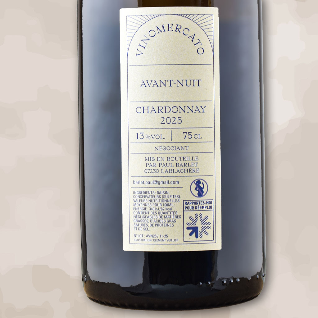 <h6>Avant Nuit</h6>Avant Nuit 2025, vin naturel d'Ardèche signé Paul Barlet. Un primeur blanc 100% Chardonnay, issu d'un pressurage direct. Au nez ça me rappelle l'anis, le fenouil. En bouche, tu as une belle fraîcheur et en même un côté rond, gourmand. Un blanc facile à boire, parfait pour l'apéro, sur une planche de fromages, ou pourquoi pas sur des gambas à la plancha.