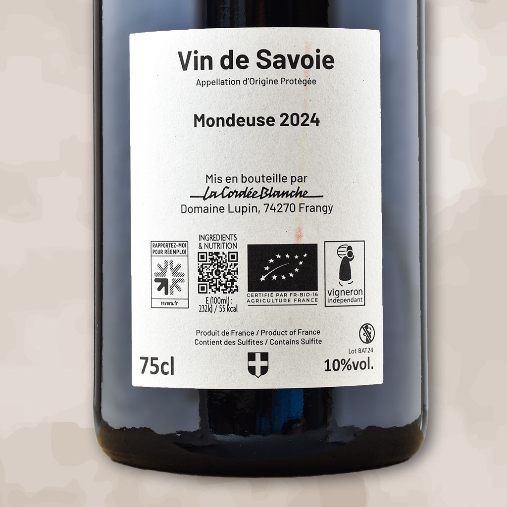 Parcelle de Mondeuse exposée sud – sud/ouest. Sol argilo-calcaire, avec du grès molassique plutôt sableux (fraîcheur) et moraine glacière caillouteuse (complexité). Très forte pente, jusque 70% autour des 400 mètres d’altitude. Raisins égrappés, macérés 10 jours. Elevage de 7 mois en fûts de plusieurs vins.