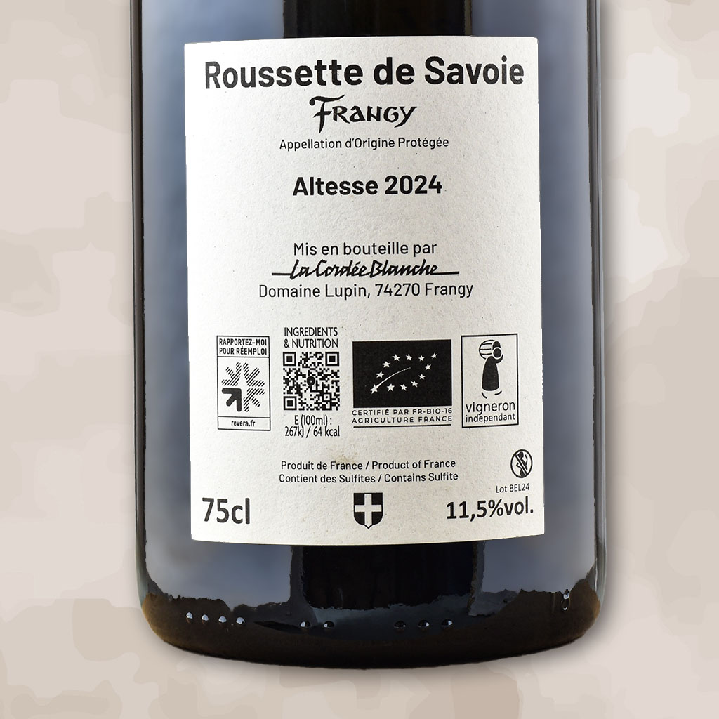 <h6>Bel Air</h6>Bel Air 2024, signé Ylan et Cyril du domaine de La Cordée Blanche. 100% Altesse, issue d'une parcelle exposée plein Sud, sur des sols argilo-calcaires, avec des grès molassiques (fraîcheur) et moraine glacière caillouteuse. Les vignes se situent entre 350 et 450 mètres d'altitude. Côté vinif, l'élevage se fait sur lies pendant 7 mois en cuve d'acier émaillé. Un blanc sec d'une fraîcheur juvénile, alliant tension et légère rondeur, minéral, avec des notes florales (acacia). Digeste, facile à boire, pourquoi pas à l'apéro sur une planche de fromages (type tome ou beaufort) ou bien sur un repas végé. Pourquoi pas un risotto aux asperges (en fonction de la saison bien sûr) Conseil des vignerons : ne pas servir leurs blancs trop frais. Idéal autour de 12-13°C.