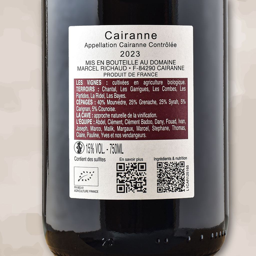 <h6>Cairanne</h6>Cairanne 2023, du domaine Marcel Richaud. Un assemblage de Mourvèdre (40%) Grenache (25%), Syrah (25%) avec un tout petit peu de Counoise et de Carignan. Un assemblage de différents terroirs de Cairanne pour assurer harmonie et complexité. Elevage de 10 mois en cuve béton (60%), en demi-muids et foudre. Quelle gourmandise ! Le nez est éclatant de fruits, ça me rappelle la confiture de cassis. En bouche, le Cairanne est ample, la matière veloutée, avec des tanins fondus, le fruit mûr côtoie les épices. Un vin de repas savoureux et réconfortant, prêt à boire, qui devrait rester à son apogée jusqu'en 2027-2028. A ouvrir sur un bon repas d'automne-hiver au coin du feu. Pourquoi pas sur une viande mijotée, confite (type agneau) ou sur un magret de canard.