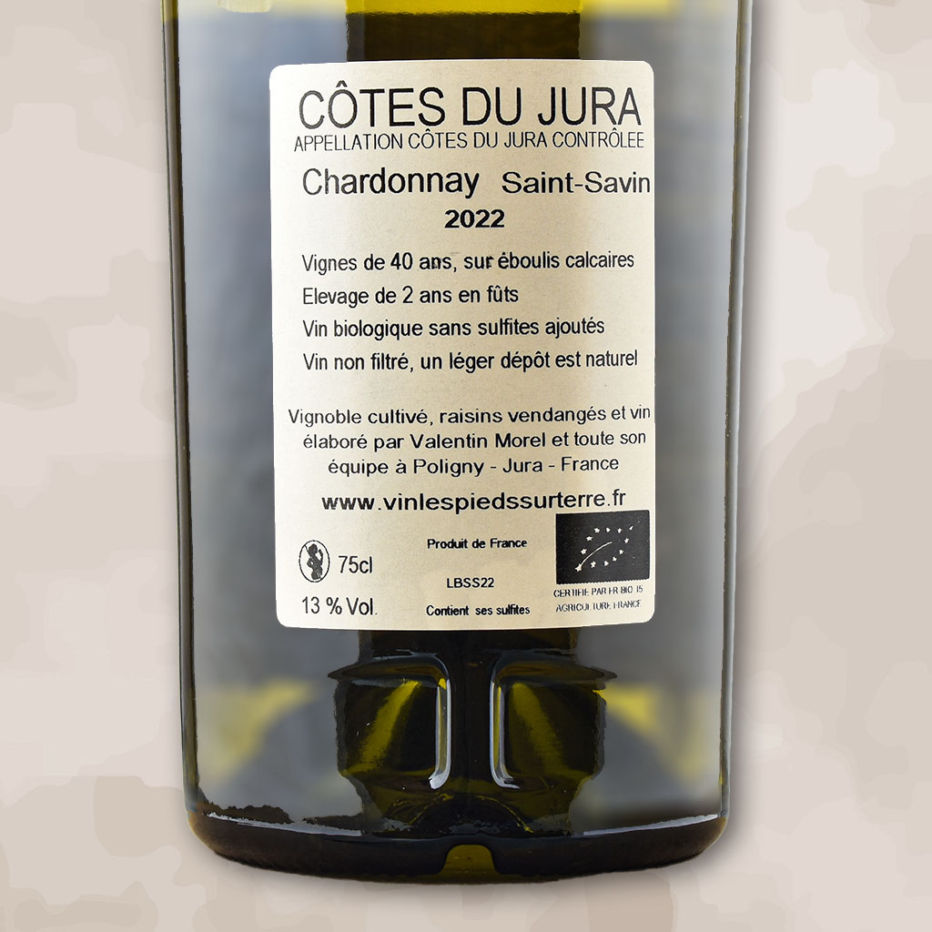 Chardonnay Saint-Savin 2022, Côtes-du-Jura signé Valentin Morel du domaine Les Pieds sur Terre dans le Jura.