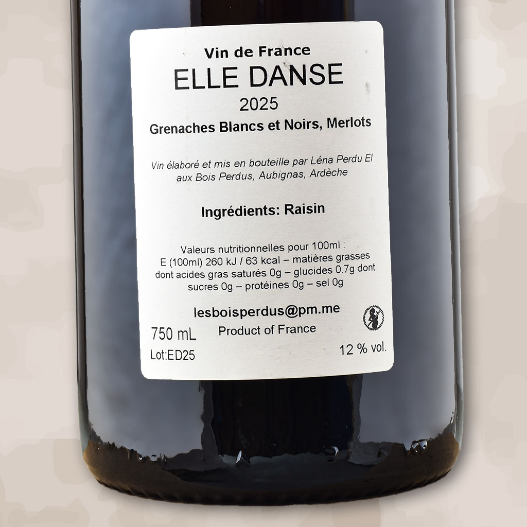 <h6>Elle Danse</h6>Elle Danse 2025, des Bois Perdus, domaine d'Alexis Robin et de Léna Perdu. Presses directes de 48 heures de Grenache Blanc, Grenache Noir et Merlot (sur basaltes). Un profil de rosé plus clair que sur 2024, léger, juteux, fruité, frais et salivant. Elle Danse, à servir frais (10-12°C) à l'apéro les jours ensoleillés, les lunettes de soleil au nez. Une fois ouverte, ne pas tarder à finir la bouteille (ce vin n'apprécie pas trop l'oxygène)