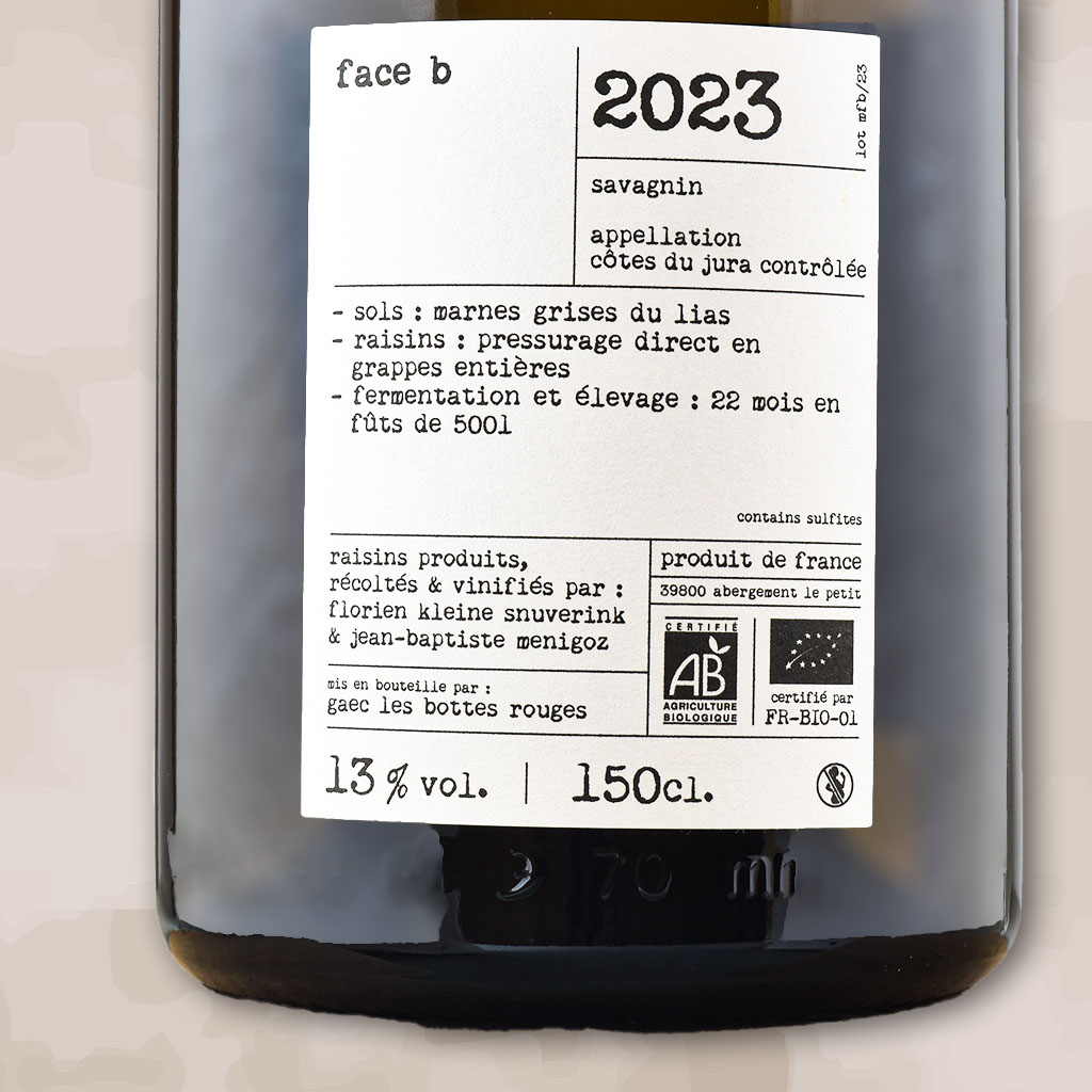 Choix des options Ce produit a plusieurs variations. Les options peuvent être choisies sur la page du produit<h6>Magnum Face B</h6>Magnum de Face B 2023, signé Les Bottes Rouges dans le Jura. Un pur Savagnin issu d'un terroir de marnes grises du Lias. Ouillé et élevé 18 mois en fûts de 300L. J'adore ! C'est complexe, élégant et gourmand, il y a un peu de rondeur. Et en même temps on salive, c'est minéral, salin, avec une belle fraîcheur qui rappelle les agrumes. Un très joli vin blanc naturel du Jura idéal pour les repas festifs, surtout avec de beau format Magnum !