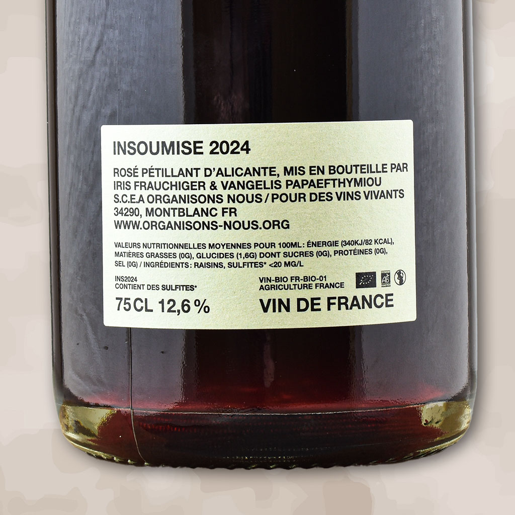 <h6>Insoumise</h6>Insoumise 2024, signé Iris Frauchiger et Vangelis Papaefthymiou du domaine Organisons-Nous dans le Languedoc. Iris et Vangelis signent un premier millésime réussi, à l'image de ce pétillant naturel d'Alicante Bouschet.
