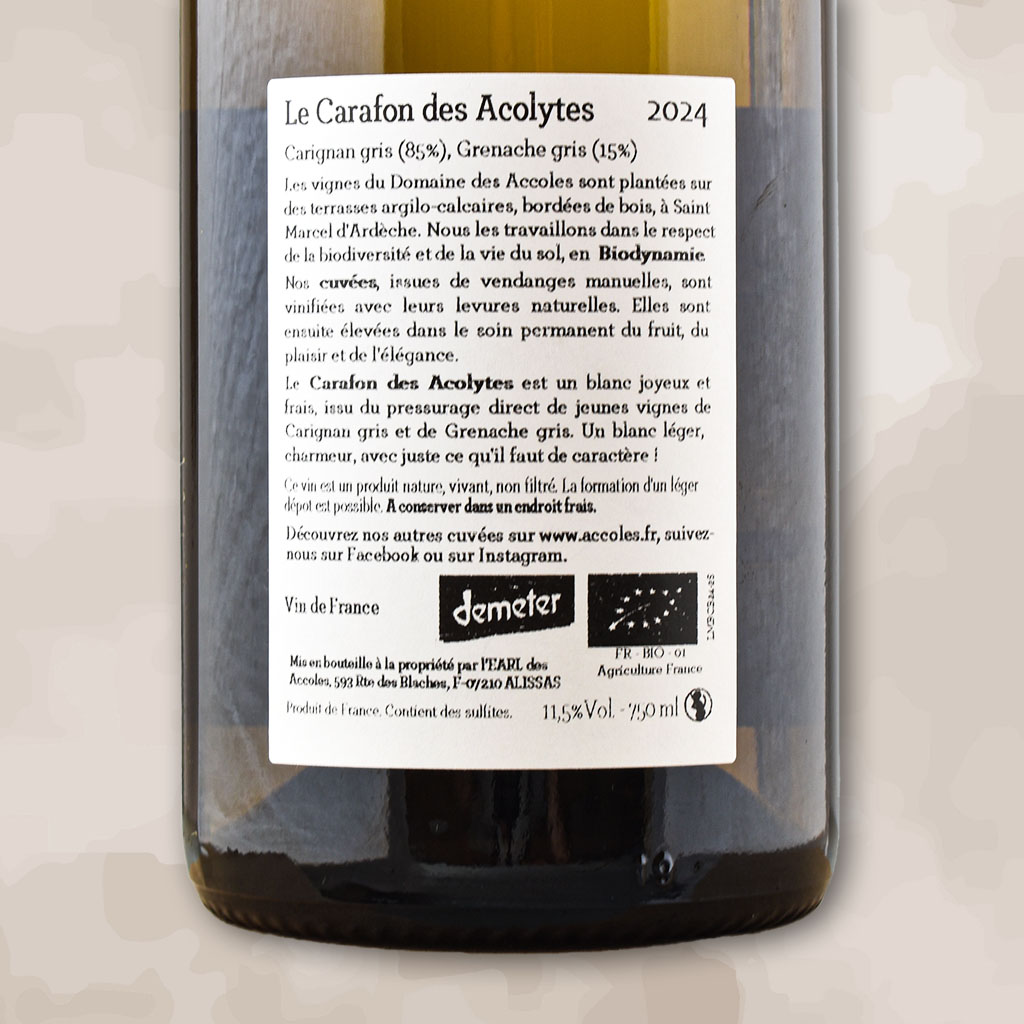 Choix des options Ce produit a plusieurs variations. Les options peuvent être choisies sur la page du produit<h6>Le Carafon des Acolytes</h6>Le Carafon des Acolytes 2024, du domaine des Accoles d'Olivier et Florence Leriche, en Ardèche du Sud. Un blanc sec original de par son assemblage : 85% Carignan Gris et 15% Grenache Gris. Coup de coeur pour ce blanc frais, tendu, avec une surprenante vivacité pour un blanc du Sud. C'est tout l'avantage du Carignan gris : obtenir un vin à faible degré d'alcool tout en étant mûr (11,5°) Un blanc minéral à servir bien frais à l'apéro !