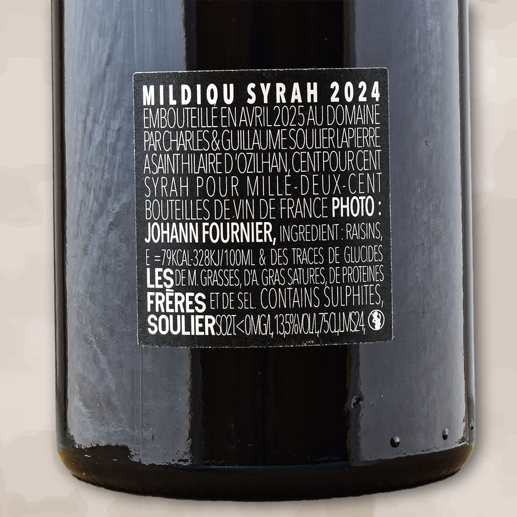 <h6>Mildiou Syrah</h6>Mildiou Syrah 2024 signé Les Frères Soulier, vignerons nature dans le Gard. "Mildiou", reflet d'une année très compliquée avec des pluies excessives et des rendements à seulement 5 hl/ha. Cette cuvée réunit toutes les syrah du domaine (sauf celles destinées à La Clastre), macérés pendant 72 heures. Résultat, on obtient un rosé éclatant de fruits : fruits rouges, fruits jaunes et litchi. En bouche, les tanins sont fins, délicats et le vin salivant. Un vin vibrant ! Seulement 4 barriques, édition limitée. Un rosé de repas, à ouvrir uniquement en excellente compagnie ! Pourquoi pas sur un poisson grillé ou bien en ceviche.