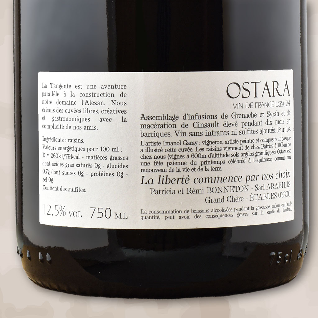 <h6>Ostara</h6>Ostara 2024, un rouge clair de Grenache noir, Syrah et Cinsault vinifiés en infusion par le domaine de l'Alezan. 8 mois d'élevage en foudre et en tinajas pour gagner en profondeur et en complexité, avec des notes épicées. Un rouge frais, d'une grande buvabilité et éclatant de fruit, plein d'énergie. A boire légèrement rafraîchi (14°C), pourquoi pas à savourer sur de bonnes pizzas maison ou encore sur un tartare de boeuf.