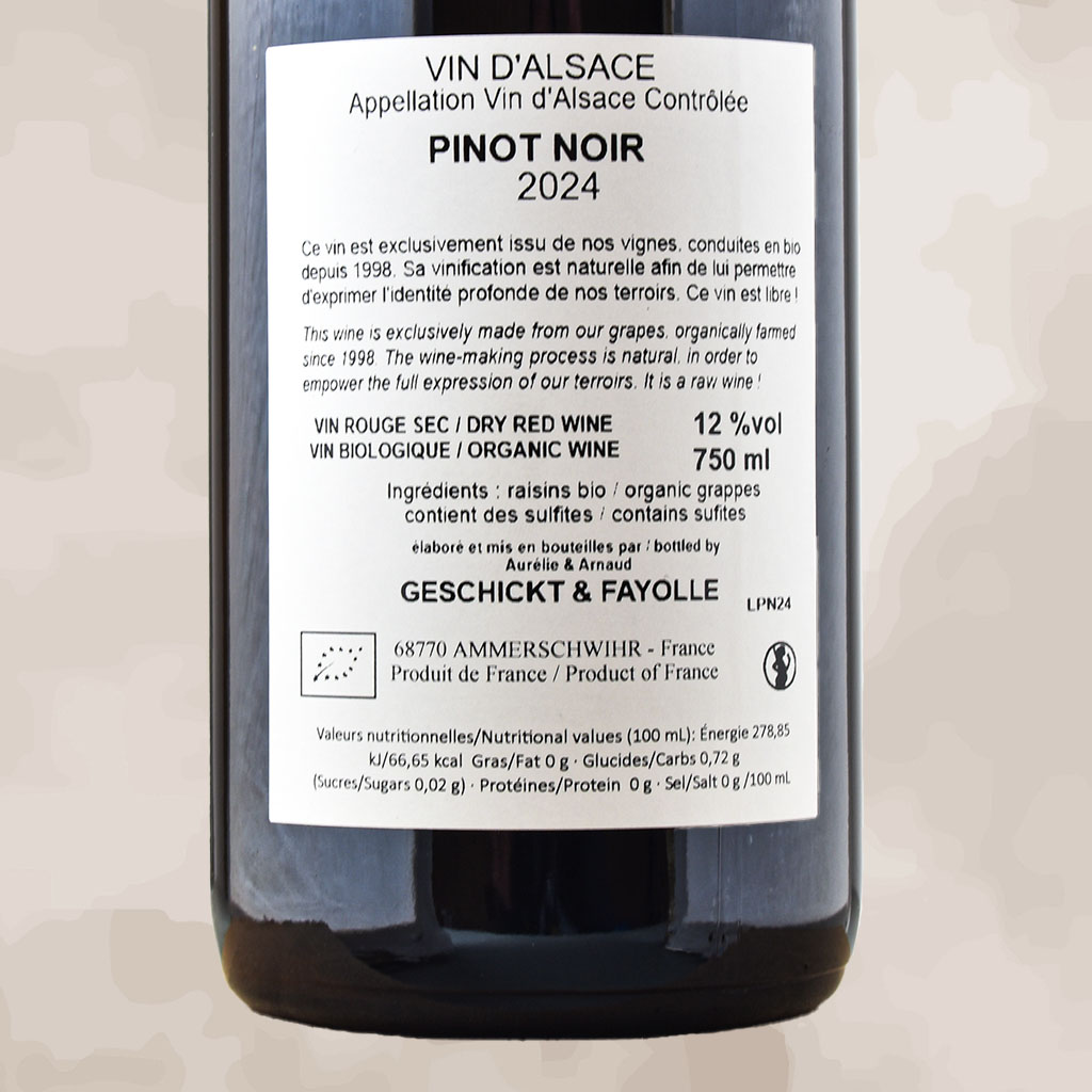 <h6>Pinot Noir</h6>Pinot Noir 2024, le pinot du domaine Geschickt, égrappé, macéré 10 jours et élevé 1 an en foudre de chêne. J'ai été séduite par son éclat, sa finesse, sa matière soyeuse, son aromatique sur le fruit croquant (cerise), sa salinité. Légère réduction à l'ouverture (avec un côté fumé), n'hésite pas à carafer 30 minutes à l'avance si besoin. Coup de coeur pour cet élégant vin rouge naturel d'Alsace. *dernières bouteilles du millésime 2023, n'hésite pas à indiquer en note de commande ta préférence.