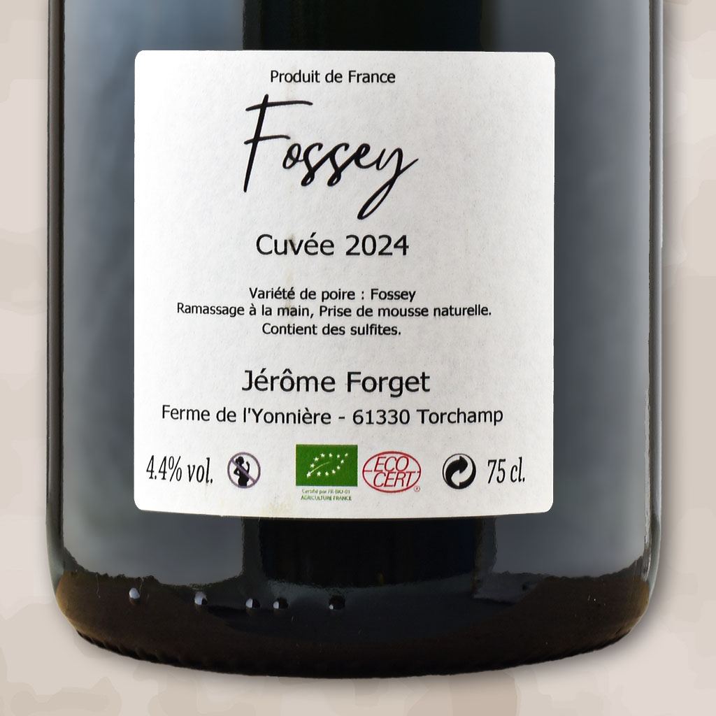 Poiré Fossey 2024 (75 cl) de Jérôme Forget, poiréculteur et cidriculteur, à l’origine de la Ferme de l’Yonnière en Normandie.