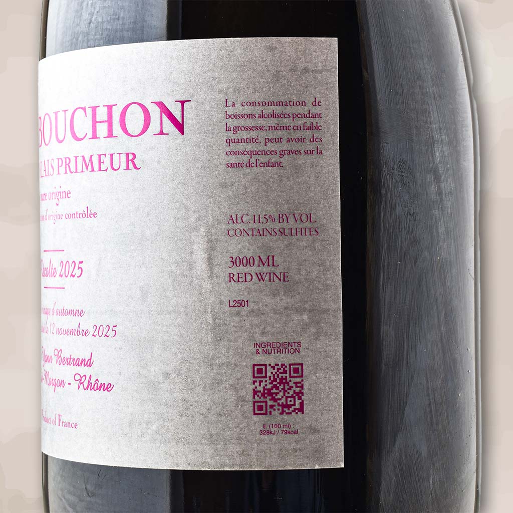 <h6>Jéroboam P'tit Bouchon</h6>Jéroboam de P'tit Bouchon 2025, Beaujolais Primeur signé Yann Bertrand, du domaine Les Bertrand. Une petite bombe ! Un gamay issu de macération carbonique (à froid) sur 10 jours. Un vin rouge pur, éclatant de fruits rouges (fraise, framboise). En bouche le vin est lumineux, frais, sur le fruit croquant, les tanins sont soyeux. La finale est minérale, salivante avec une touche épicée. Bref un très joli vin, qui dans ce format d'exception (3 litres !), pourra se conserver 4 à 5 ans (bien sûr, dans des conditions optimales de stockage)