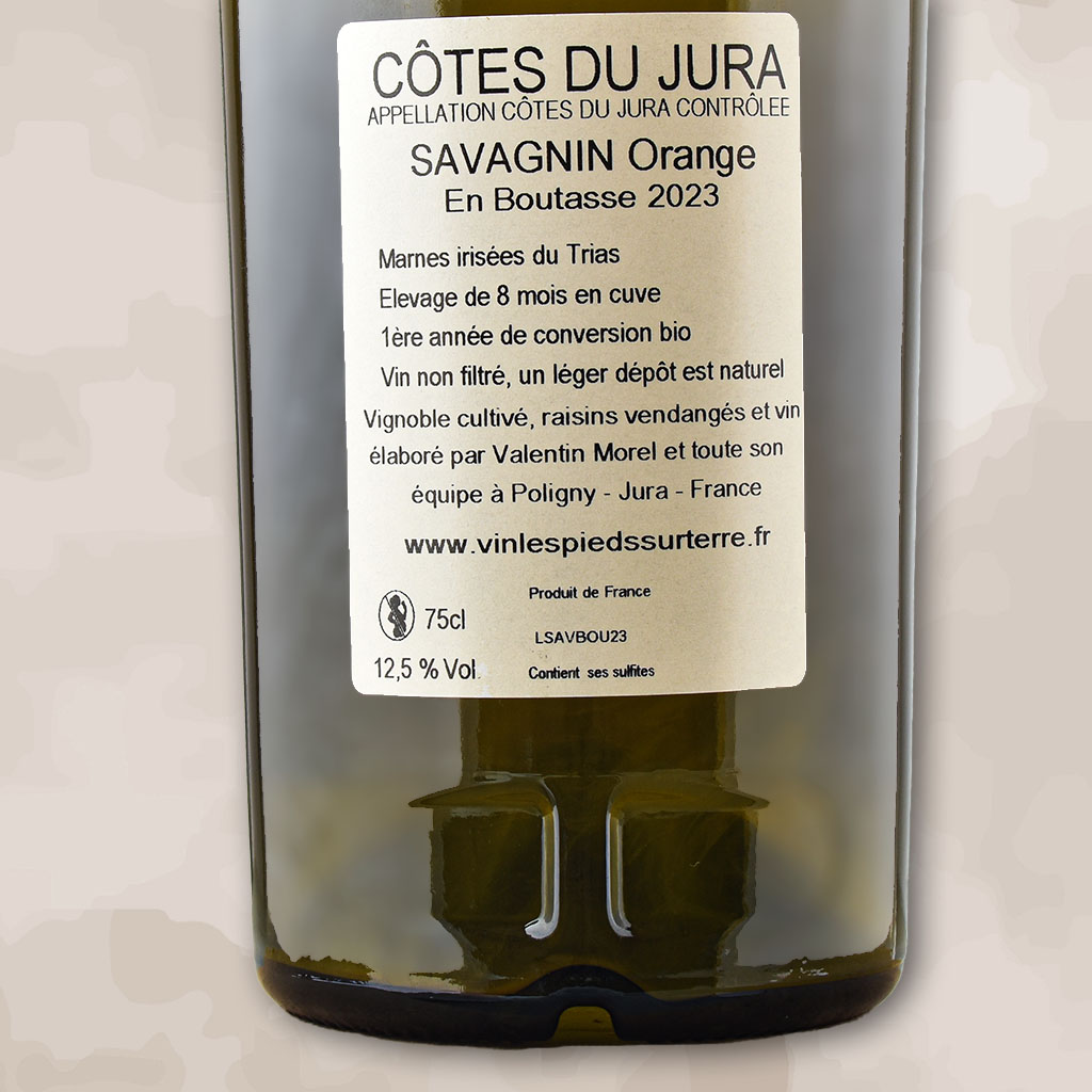 <h6>Savagnin en Boutasse</h6>Savagnin en Boutasse 2023, signé Valentin Morel du domaine Les Pieds sur Terre dans le Jura. Une macération de trois semaines de Savagnin issus d'un terroir de marnes du Trias, élevé 8 mois en cuve. Les vignes sont en cours de conversion bio. Coup de coeur pour ce vin orange plus aromatique que le précédent (Savagnin en Bois d'Arnaux), avec des notes d'agrumes, de citron. En bouche, le vin est fluide, très frais, il n'y a presque pas de tanins. La finale est saline, salivante Très joli vin nature du Jura, merci à Valentin Morel ! Côté accord, tu peux varier les plaisirs : crustacés (types gambas), wok de légumes au gingembre, plats "frais" agrémentés de citron, d'herbes fraîches