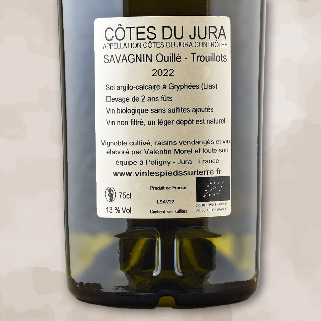 <h6>Savagnin Ouillé</h6>Savagnin Ouillé 2022, signé Valentin Morel du domaine Les Pieds sur Terre dans le Jura. Ce Savagnin provient du terroir d'éboulis calcaires de Saint-Savin et d'argiles des Trouillots. Ouillé et élevé deux ans en demi-muids. Grand vin ! Pureté, complexité aromatique, tension, avec une belle acidité et minéralité. Un vin ciselé, salin et sapide à ouvrir un jour de fête en excellente compagnie ! Pourquoi pas sur des poissons fins, des fromages à pâte pressée cuite, ou sur une cuisine plus exotique (par exemple à base de citron, de gingembre, de coriandre) Très joli vin nature du Jura, merci à Valentin Morel !