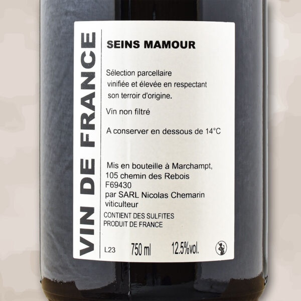 <h6>Seins Mamour</h6>Seins Mamour 2023 signé Nicolas Chemarin à Marchampt, village du Beaujolais perché à 450 mètres d'altitude. Assemblage de jus de presse avec une macération d'un mois en grappes entières de gamay de Saint Amour. Coup de coeur pour ce rouge très gourmand, fruité (fruits rouges mûrs), épicé, minéral, structuré certes, mais digeste, juteux. La finale épicée fait saliver. Un bel équilibre pour ce joli vin qui pourra t'accompagner de l'apéro au repas. Pourquoi pas sur des grillades. N'hésite pas à l'aérer 30 minutes à l'avance.