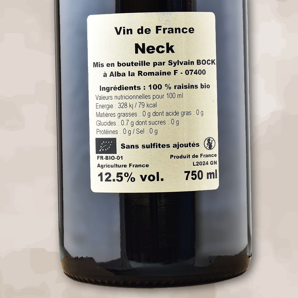 Choix des options Ce produit a plusieurs variations. Les options peuvent être choisies sur la page du produit<h6>Neck</h6>Le Neck, en géologie, c'est un genre de cheminée volcanique mise en relief par l'érosion. Ici les Grenache de Sylvain Bock proviennent d'un neck de basaltes. Vinifiés en macération carbonique, ils s'expriment sur les fruits (noirs et rouges) et la gourmandise. Un vin naturel digeste certes, mais avec de la matière, ses tanins suaves vous caressent le palais. Carafez-le au moins 30 minutes avant de servir (présence de gaz possible !)