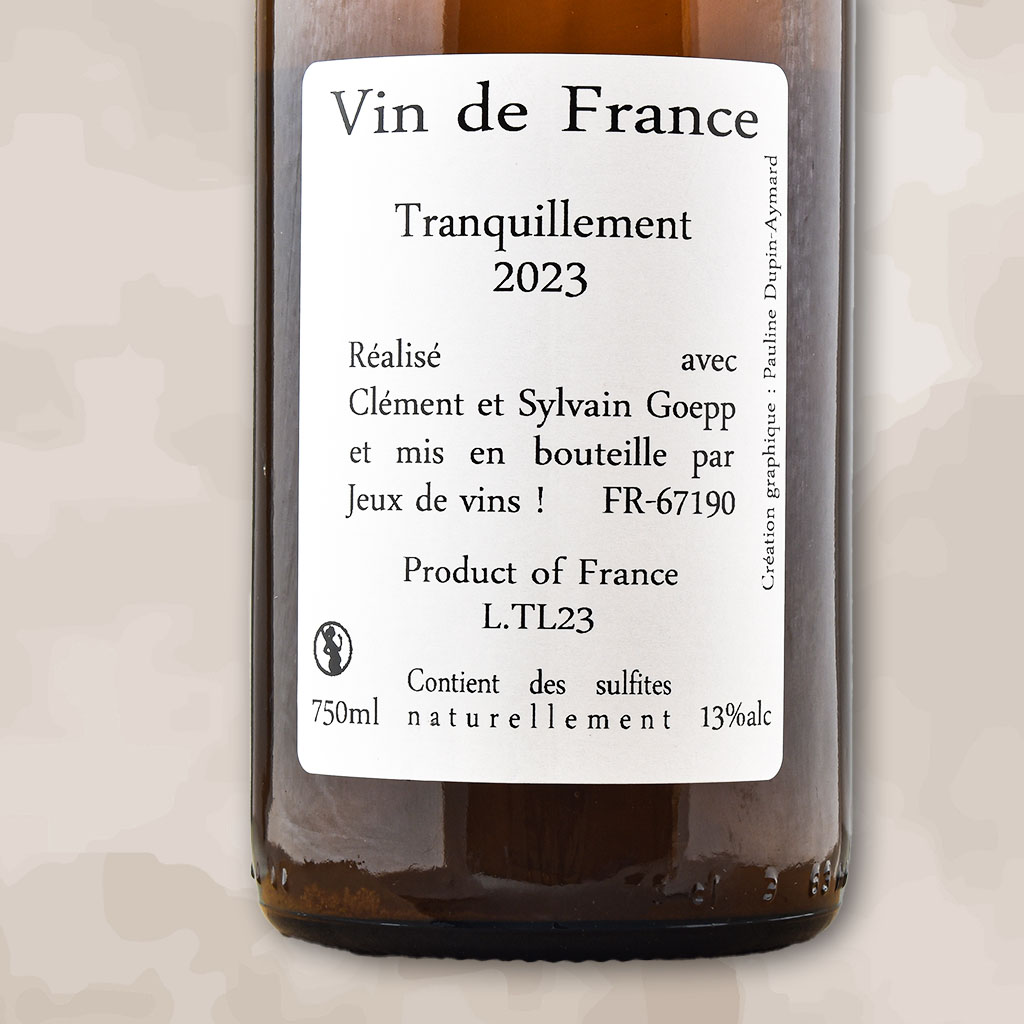 Tranquillement 2023, signé Jeux de Vins en Alsace, négoce initié par Julien Albertus.